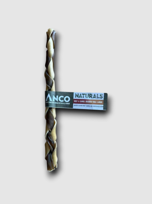 The Anco Beef & Camel Braided Roll is a deliciously satisfying chew, crafted by intertwining two premium, lean proteins—beef and camel—for a long-lasting treat your dog will love. Naturally high in protein and low in fat, this tough chew supports muscle development while helping to maintain a healthy weight. Beef provides amino acids, iron, and zinc for strong muscles and a healthy coat, while camel offers a lean, digestible protein boost.