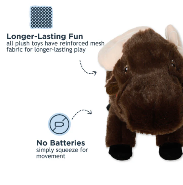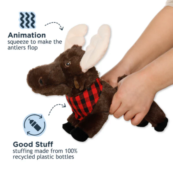 Bring a touch of woodland wonder to your dog’s toy box with the Tall Tails Animated Plush Moose. With flappy antlers, a squeaky belly, and a super cuddly body, this majestic friend is made for endless play and snuggles. Give it a gentle squeeze and watch its antlers flap – it’s a fun, surprising motion your dog will love every time. Built with durable materials and animated antlers that move with a squeeze.